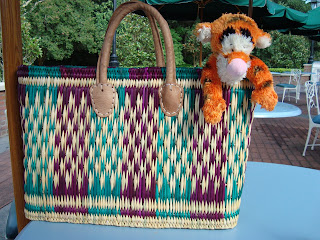 Mom and I got this bag for Dee, who is taking care of my kitty while we're in Disney. The bag is made in Morocco, and we got it in the Moroccan part at Epcot. Isn't it pretty? Tigger was checking it out.